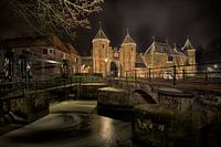 Koppelpoort Amersfoort, sfeervol verlicht bij nacht.