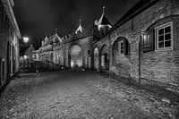 Koppelpoort Amersfoort, sfeervol verlicht bij nacht, in zwart wit.
