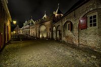 Koppelpoort Amersfoort, sfeervol verlicht bij nacht.