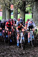 Fresco van de koppenbergcross 2023 bij de vrouwen op de kasseien van de koppenberg. Met de grote bomen op de achtergrond en op de voorgrond Sanne Cant, Fem Van Empel.