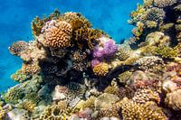 Koraalberg op de rand van het rif dak en de diepere zee. Het kenmerkt zich door de vele kleuren en de grote variatie aan vissen. Op de foto is ook een Rode Zee Doktersvis te zien. Foto is gemaakt in Marsa Alam bij het huisrif van hotel Three Corners Fayrouz.