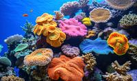 Verschillende soorten koraal, in levendige tinten van roze, blauw, geel en oranje, creëren een driedimensionaal landschap dat zowel complex als harmonieus is. De texturen van het koraal variëren van glad en golvend tot stekelig en gelaagd, elk met zijn eigen unieke patroon en vorm. Tussen de koralen door zwemmen vissen, die met hun felle kleuren een extra dimensie toevoegen aan de scène. De zonnestralen die door het heldere water heen vallen, benadrukken de levendigheid van het rif en geven de afbeelding een gevoel van diepte en vitaliteit.