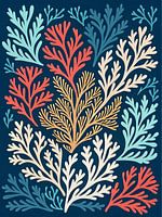 Een levendige abstracte voorstelling van koraal, met een dynamische opstelling van vertakkende vormen in een rijk kleurenpalet. Dit werk roept de schoonheid en diversiteit van het onderwaterleven op.