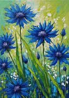 In dit acryl canvas kunstwerk valt de korenbloem op met zijn intense blauwe tinten en delicate gefranjerde bloemblaadjes. De levendige kleur en het fijne detail van de bloem maken het een opvallend middelpunt, perfect om levendigheid toe te voegen aan een werk met een natuurlijk thema.