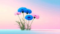 Een stilleven van een bosje korenbloemen, drie blauwe en twee roze bloemen. De illustratie ziet er surrealistisch uit, het lijkt of de bloemen uit de steriele grond groeien. Het beeld is met behulp van ai gegenereerd.