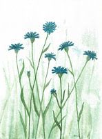 Deze delicate aquarel toont korenbloemen in prachtige blauwe en groene kleurovergangen.