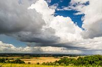 Korenvelden zover het oog reikt. Daarboven drijven dikke wolken.