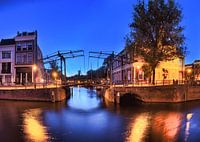 Panoramafoto van de brug over de Korte Haven in Schiedam. Samengesteld beeld uit 3 verticale opnamen. De foto werd genomen vanaf de Lange Haven, een half uur na zonsondergang.