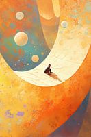 Kosmisch Schilderij | Cosmic Solitude Path - Dit abstract schilderij toont een kleine, eenzame figuur gezeten op een kronkelende weg die door een surreële wereld van gigantische cirkels en zwevende bollen loopt, met een oranje-blauw kleurenpalet dat zorgt voor een droomachtige atmosfeer.