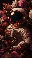 Dit kunstwerk toont een astronaut omgeven door een veld van bloemen, waarbij het ruimtepak versmelt met natuurlijke elementen. De bloemen lijken te groeien uit de achtergrond en omhullen het lichaam, terwijl in de spiegelende helm een reflectie van een sterrenhemel en een verre wereld zichtbaar is. De combinatie van ruimtevaart en flora roept een gevoel op van verwondering, alsof mens en natuur elkaar ontmoeten in een droom tussen werelden. Dit beeld legt de nadruk op rust, vergankelijkheid en ontdekking.