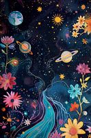 "Kosmische Flora" is een fascinerende fusie van hemelse lichamen en bloeiende flora. Dit kunstwerk neemt de kijker mee op een reis door het universum, waar bloemen en planeten naast elkaar bestaan in een harmonieuze dans van kleur en licht. De sterrenbezaaide nachtelijke hemel dient als achtergrond voor deze levendige en betoverende scène, die de verbeelding prikkelt en een gevoel van verwondering en onbegrensde mogelijkheden oproept.