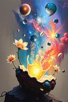 Een explosie van kleur en magie komt tot leven in dit werk, waar de grenzen tussen werkelijkheid en verbeelding vervagen. Bloeiende bloemen dansen rond een stralende gouden gloed, terwijl het universum lijkt te exploderen in een verbluffende kosmische symfonie.