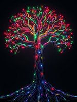 Dit betoverende kunstwerk stelt een levensboom voor met een levendig, ingewikkeld netwerk van lichtjes, als symbool voor de onderlinge verbondenheid van alle levende wezens en de energiestroom door het universum. De wortels duiken in een lichtgevend, buitenaards rijk, terwijl de takken naar de kosmos reiken, waarbij elke tak en wortel…