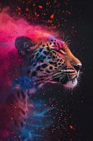 "Kosmische Panthera" dompelt de toeschouwer onder in een kosmische ervaring, waar de majestueuze kracht van de luipaard één wordt met een explosie van kleur en licht. Het contrast tussen de donkere achtergrond en de fluorescerende spetters in rood, blauw en roze accentueert de natuurlijke elegantie en de wilde geest van dit prachtige dier. De aandacht voor detail in de tekening van de snorharen tot de subtiele schaduwen op de vacht verheft deze afbeelding tot een buitengewoon kunststuk, perfect voor liefhebbers van natuur en abstracte kunst. Deze levendige voorstelling zou een opvallende aanvulling zijn in elk modern interieur en belooft een instant blikvanger te zijn in galerijen of collecties.