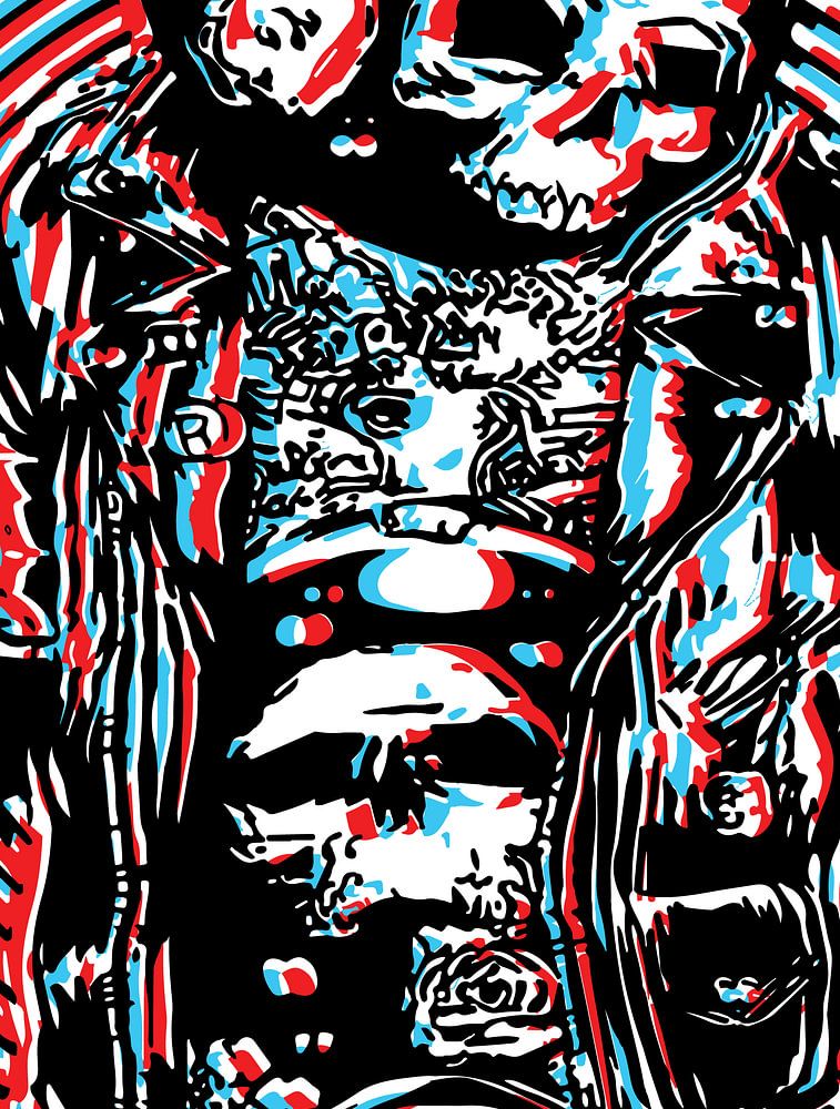 The skeleton astronaut, wearing a detailed space helmet, stands at the forefront, radiating an enigmatic aura. The skull, both haunting and alluring, symbolizes the unknown, a reminder of human curiosity and our fragile existence amidst the vast cosmos. The design uses bold, contrasting colors with a glitch effect, lending the image a three-dimensional, otherworldly quality. The concentric rings in the background draw the viewer's gaze deeper into the artwork, creating a sense of endless depth and cosmic wonder. This trippy, retro-futuristic style appeals to a range of tastes, from cyberpunk and steampunk lovers to those who appreciate gothic and alternative art.