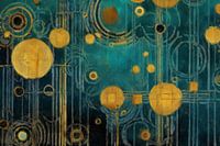 Dit werk toont een abstracte compositie van cirkels en lijnen die doen denken aan een kosmische kaart. De achtergrond is een rijke mix van blauw- en groentinten, terwijl de cirkels en lijnen in gouden en gele tinten zijn weergegeven. De strakke lijnen en geometrische vormen creëren een gevoel van orde en harmonie te midden van de abstracte ruimte.