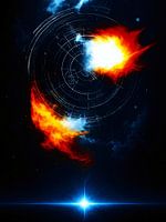 Het samenspel van licht, kleur en vorm nodigt de kijker uit in een moment van kosmische verwondering - waar sciencefiction en abstracte schoonheid elkaar ontmoeten.