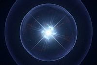 Een heldere, stralende bol omhult een stellaire kern in de donkere ruimte.