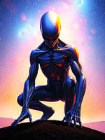 Dit indrukwekkende digitale kunstwerk toont een indrukwekkende buitenaardse figuur in een gehurkte positie op een rotsachtig oppervlak. De alien heeft een slank, gespierd lichaam met een reflecterende, metaalblauwe huid. Fijne patronen en felrode accenten lopen door zijn lichaam, wat duidt op geavanceerde technologie of biologische verbetering. De houding straalt alertheid en gereedheid uit - alsof het wezen een verre planeet bewaakt of observeert.