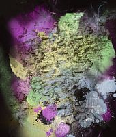 De levendige kleurexplosies in paars, groen, blauw en geel versmelten met texturen en zachte lichtaccenten - als een pulserend ritme van het universum.