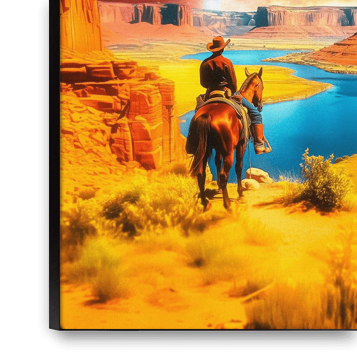 "The Cosmic Frontier" is een buitengewone fusie van klassieke westernlandschappen en buitenaardse kosmische schoonheid. Een eenzame cowboy te paard kijkt uit over een eindeloze canyon die wordt uitgesleten door gloeiende rivieren, terwijl een hemel vol stralende sterren zich daarboven uitstrekt. De warme tinten van rode rotsformaties…