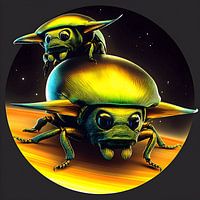 Twee stralende, buitenaards uitziende kevers met glanzende gouden schildjes marcheren brutaal over een planetaire horizon, hun figuren gloeiend van kosmische energie onder een met sterren bezaaide hemel. Hun iriserende schild glinstert in groene en gouden tinten en combineert de majesteit van de natuur met de mystiek van de ruimte. De ene kever rijdt bovenop de andere, symbool voor veerkracht, eenheid en de eeuwige cyclus van hoederschap in het universum.