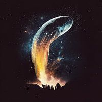 Im Mittelpunkt steht der Komet selbst, der in einem schwungvollen Bogen nach unten rast und die Komposition dominiert. Sein eisiger Kern schimmert in silbrig-blauen Farbtönen und erinnert an die kalte Weite des interstellaren Raums, aus dem er hervorgegangen ist. Von diesem hellen Kopf geht eine glühende Kaskade leuchtender Partikel aus, die in Gold-, Bernstein- und feurigen Orangetönen gemalt sind. Diese Lichtstreifen wirken fast flüssig und fließen wie geschmolzenes Feuer durch das Vakuum des Kosmos, wodurch sie sowohl Anmut als auch unaufhaltsame Dynamik vermitteln.