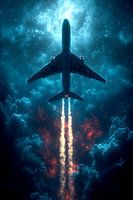 Een artistiek bovenaanzicht van een straalvliegtuig dat opstijgt door een gloeiende blauwgroene nevel. De vurige condensstrepen zien eruit als sterrenstof en veranderen een gewone vlucht in een reis door de melkweg. Een verbluffende combinatie van luchtvaart en ruimtevaartfantasie.