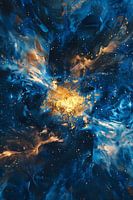 Dit werk verbeeldt een explosieve uitbarsting van licht in blauwe en gouden tinten, die doet denken aan een kosmische explosie of een storm van sterren. De energieke vormen en het krachtige kleurenpalet maken dit schilderij tot een dynamisch en inspirerend kunstwerk dat de kijker in zijn ban houdt.