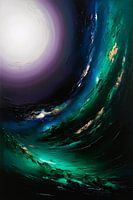 Dit ontwerp neemt je mee naar de oneindigheid van het universum. De krachtige, vloeiende beweging van kleuren zoals groen, blauw en zwart lijkt een kosmische stroom van energie te symboliseren. Het grote lichte gebied aan de linkerkant straalt mysterie uit, terwijl het contrast met de donkere, wervelende kleuren dynamiek en diepte…