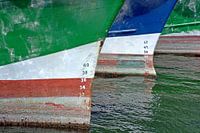 IJkmerken op de boeg de aangroei van schelpen en wier. De verbleekte kleuren net als deze schepen die niet meer bestaan. De glinstering van het water op de rompen van de schepen.