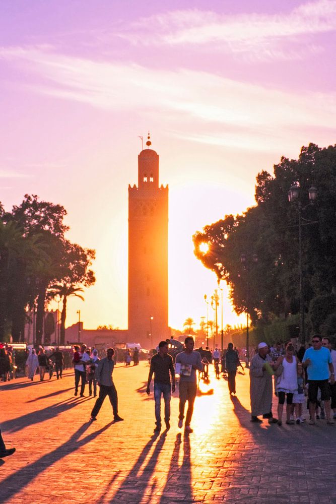 Koutoubia moskee bij zonsondergang in Marrakesh Marokko