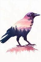 Een mystieke raaf, wiens silhouet samensmelt met een adembenemende natuurlijke achtergrond, ontvouwt de fascinerende schoonheid van bossen en bergen. De zachte kleuren van de zonsondergang geven het beeld een dromerige uitstraling. Ideaal voor de woonkamer of hal, het brengt een vleugje magie en inspiratie in elke kamer.