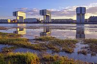 De kraanhuizen in Keulen aan de Rijn bij zonsondergang.