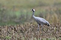 Kraanvogel ( Grus grus ) tijdens de vogeltrek op zoek naar voedsel op een geoogst veld, typisch beeld, wild, Europa.