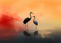 Kraanvogel Kunstwerk - Twee gracieus afgebeelde kraanvogels staan centraal op het schilderij, met hun reflectie zichtbaar tegen een indrukwekkende achtergrond van een ondergaande of opkomende zon. De zachte overgang van warme oranje naar koele grijstinten creëert een serene sfeer die de elegantie van de vogels complimenteert. Dit…