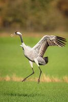 Een kraanvogel (Grus Grus) danst in een veld bij Diepholz in Duitsland tijdens de najaarstrek. Kraanvogels voeden en rusten in de velden rond de moerassen in Nedersaksen, Duitsland, tijdens hun trek van de broedgebieden in Noord-Duitsland, Polen en Scandinavië naar hun winterverblijf in Spanje en Noord-Afrika.