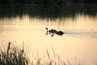 Kraanvogels 's avonds in de zomer, zwemmend op een meer