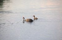 Kraanvogels 's avonds in de zomer, zwemmend op een meer