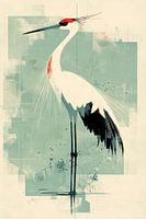 Dit kunstwerk toont een elegante kraanvogel met een rode kop en contrasterende zwarte en witte accenten. De vogel staat fier in een abstracte compositie van zachte blauwgroene tinten en subtiele geometrische vormen, wat een modern en verfijnd geheel creëert. De fijne lijnen van de veren en de gebalanceerde kleuren geven het werk een tijdloze schoonheid en een serene uitstraling. Perfect voor hedendaagse interieurs die een mix van natuur en abstractie omarmen.