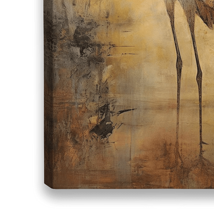 Kraanvogel in Abstract | Kraanvogel - Met z'n subtiele penseelvoering en zachte aardetinten brengt dit schilderij van een statige kraanvogel een kalme sfeer in elke ruimte. De artiest heeft door middel van textuur en een vleugje oranje een levendig, bijna impressionistisch beeld gecreëerd dat zowel modern als tijdloos…