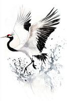 Elegantie in beweging: Een majestueuze kraanvogel ontvouwt zijn prachtige vleugels in een dans tussen water en lucht. De zachte waterkleuren geven het beeld een kalme, harmonieuze uitstraling. Ideaal voor de slaapkamer om een vredige sfeer te creëren of als blikvanger in de woonkamer om een gesprek te stimuleren.