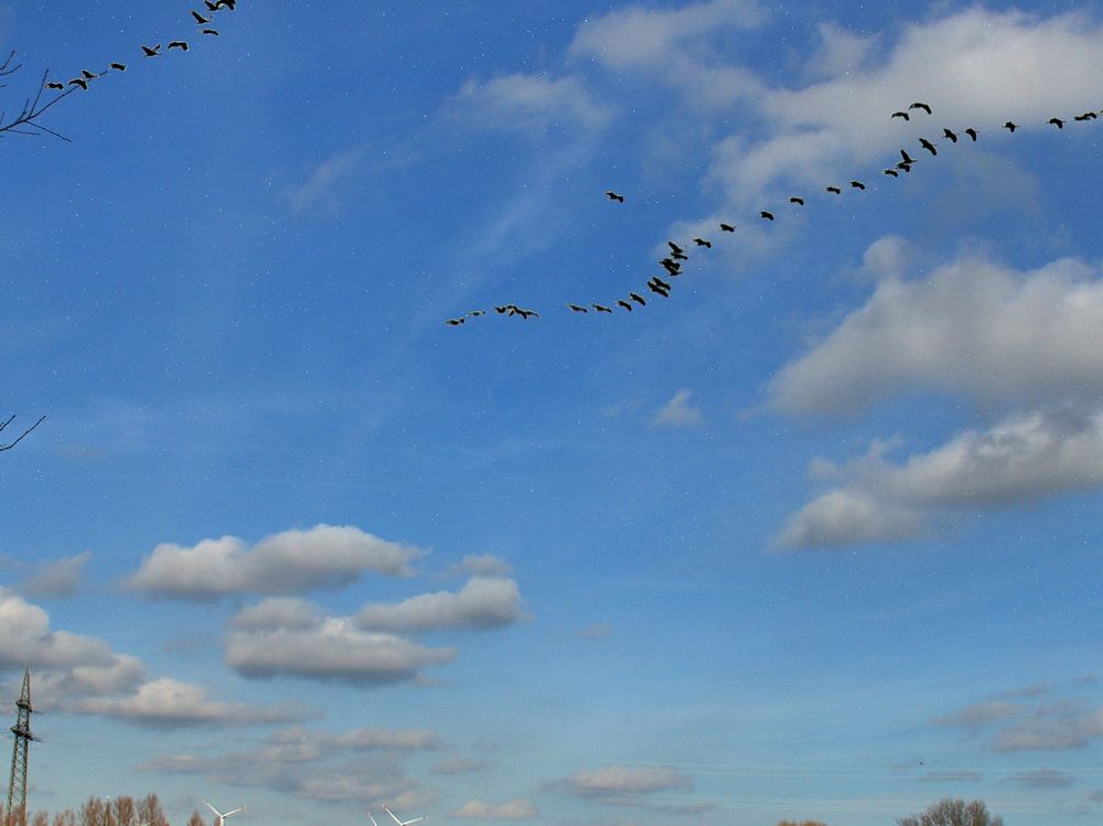 Terugkeer van de kraanvogels boven de weiden van de Lippe in Haltern am See