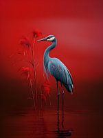 Een sierlijke kraanvogel staat statig in een plasje water, als een serene danser op een podium. Zijn spiegelbeeld weerspiegelt de perfectie van zijn gestalte. In dit intieme moment van reflectie ademt de omgeving rust en harmonie, terwijl de kraanvogel vol gratie de tijd lijkt te vertragen.