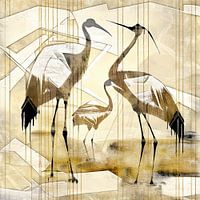 Abstracte afbeelding van kraanvogels met lijnen en vlakken. Passend bij diverse trends, waaronder Beige & Organic. Prachtige vlakverdeling, waarbij gebruik gemaakt is van verschillende materialen, zoals textiel. Japandi.