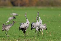 Kraanvogels (Grus Grus) tonen zich in een veld bij Diepholz in Duitsland tijdens de najaarstrek. De kraanvogels voeden en rusten in de velden rond de heidevelden in Nedersaksen, Duitsland, tijdens hun trek van de broedgebieden in Noord-Duitsland, Polen en Scandinavië naar hun winterverblijf in Spanje en Noord-Afrika.
