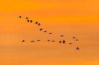 Een groep van 21 kraanvogels strijkt neer in de avond om te gaan slapen in het veen. Het is na zonsondergang; de lucht kleurt diep oranje.