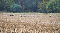 Kraanvogels op een geoogst veld. Dierenfoto van trekvogels.