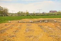 Kraanvogels op een geoogst veld. Dierenfoto van trekvogels.