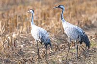 Kraanvogels (Grus Grus) aan het eten en aan het rusten in een veld bij Diepholz in Duitsland tijdens de herfsttrek